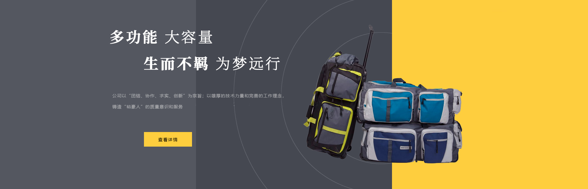 本公司是一家集設計,制造,加工,貿易為一體的專業(yè)箱包生產出口企業(yè)。已有20多年箱包生產經驗。公司廠區位于中國浙江省海寧市鹽官工業(yè)園區,占地15000平方米,建筑面積10000平方米,員工150人,年生產能力260萬只(套)。 公司以尼龍,滌淪,牛津布,P...